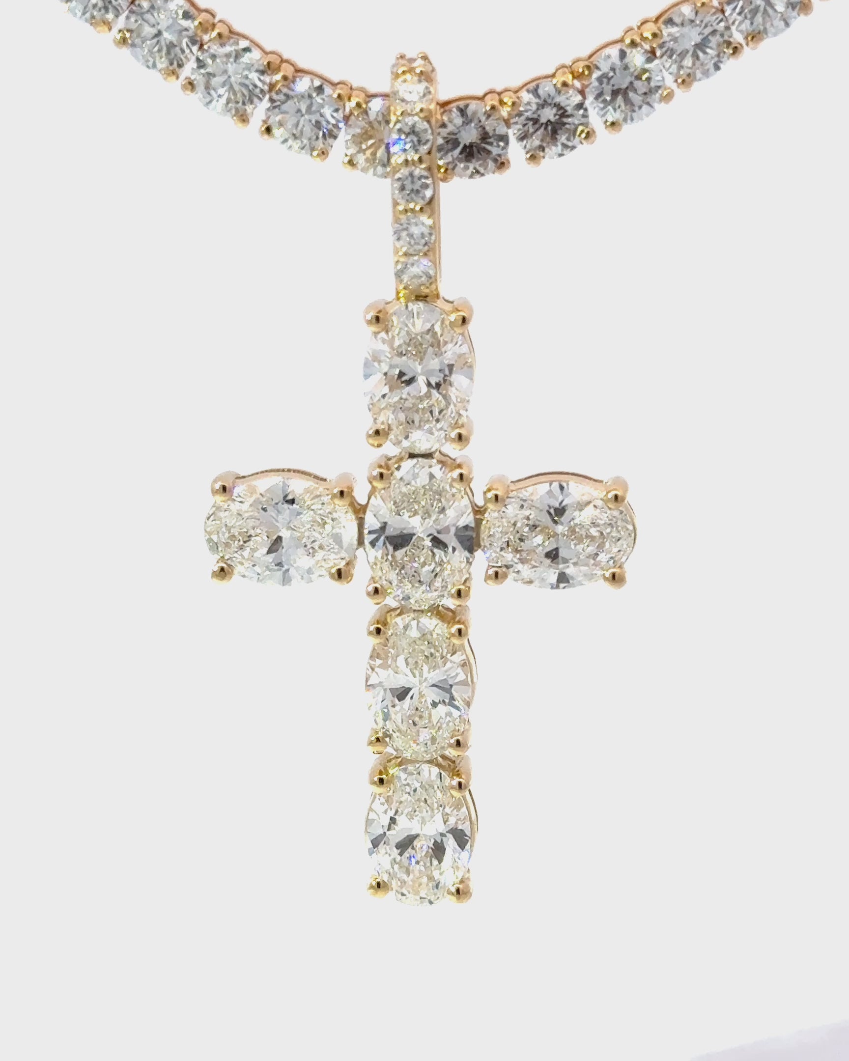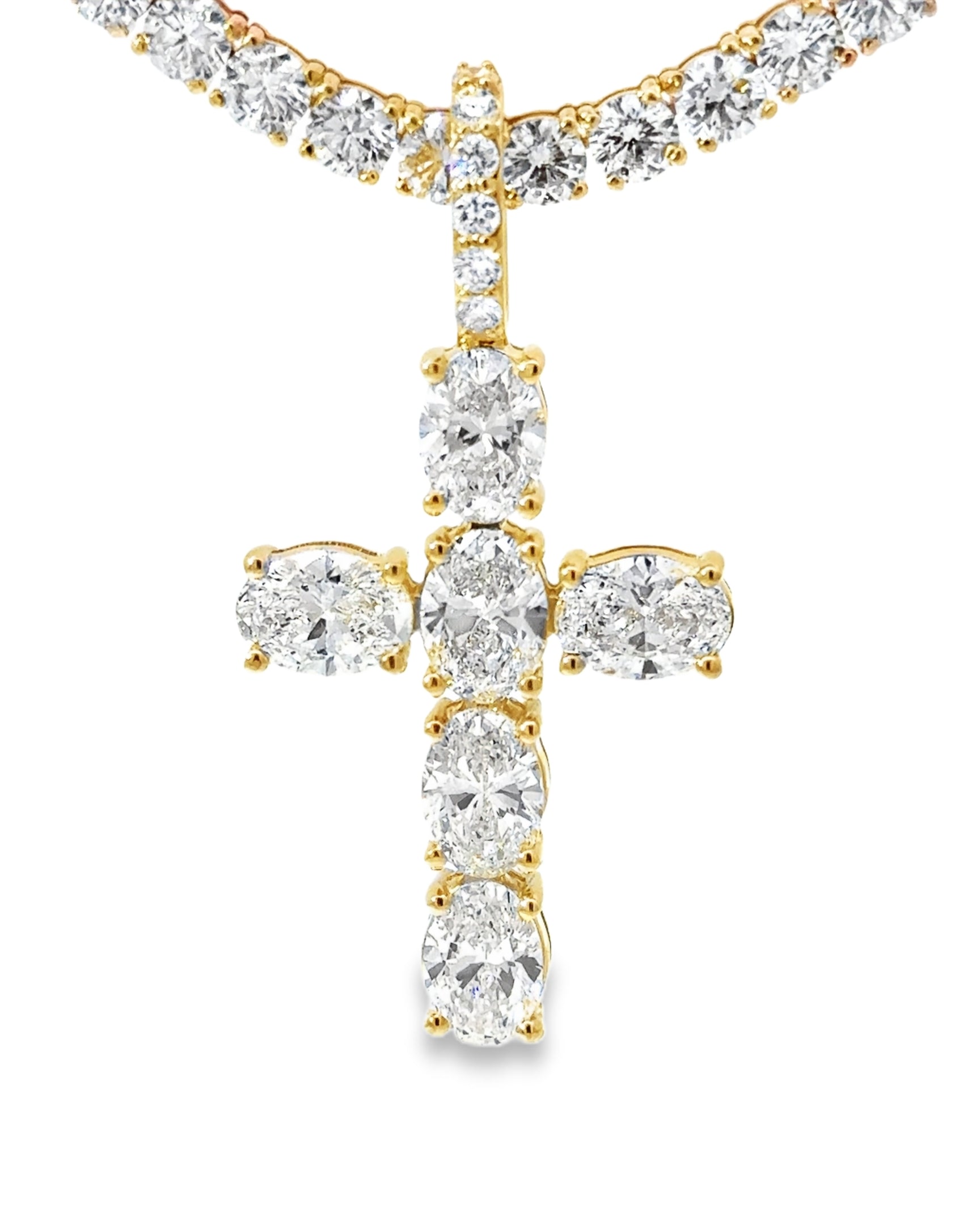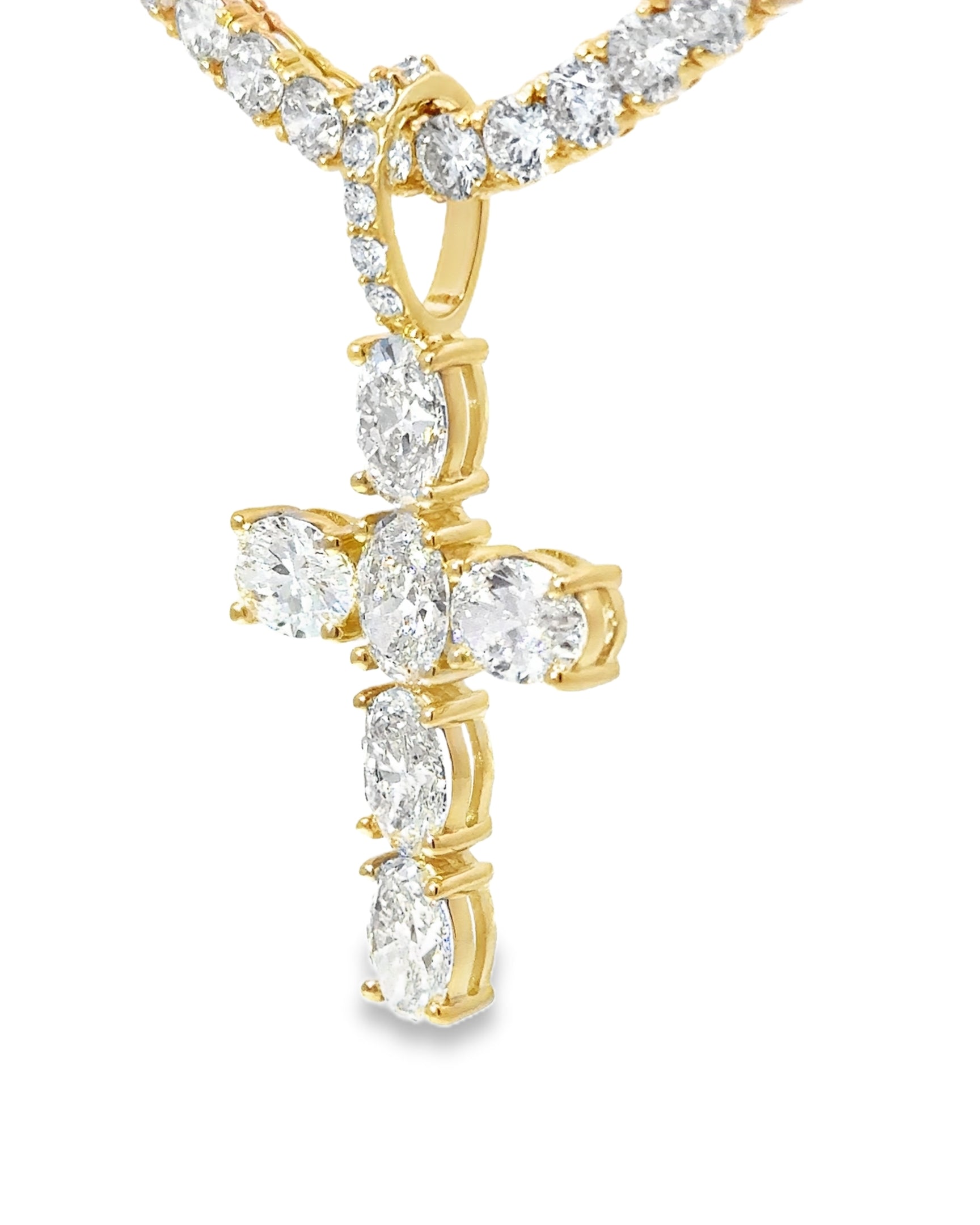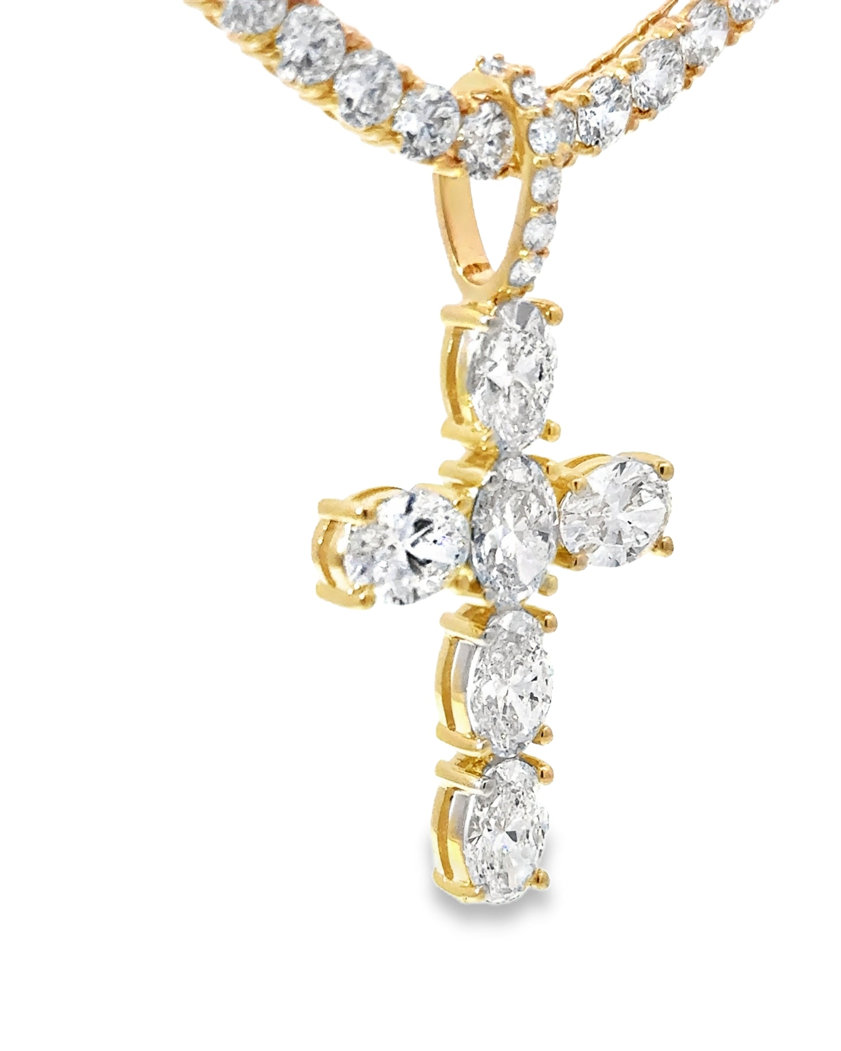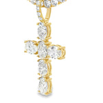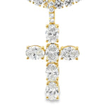 This Elegant lab Diamond Cross Pendant combines timeless design with expert craftsmanship. Featuring precisely set oval diamonds, it offers 6.24 CTTW Lab Diamonds VS/E-F set in 14kt YG.